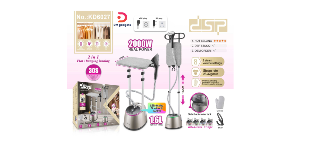 DSP®KD6027 2 in 1 Garment Steamer Vertical steam ironing system 2000W 1.6L Water Tank – Silver