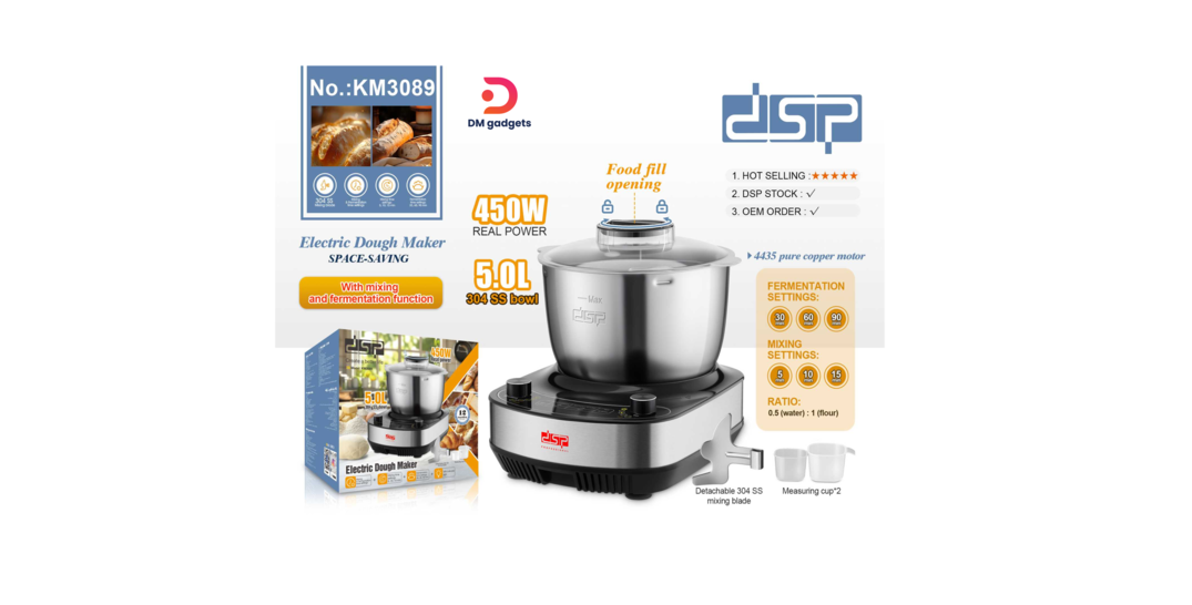 Ηλεκτρικός παρασκευαστή ζύμης (dough maker) KM3089 από την DSP, με λειτουργίες ανάμειξης και ζύμωσης, ιδανική για υπέροχες, αφράτες σπιτικές ζύμες, χωρίς κόπο.