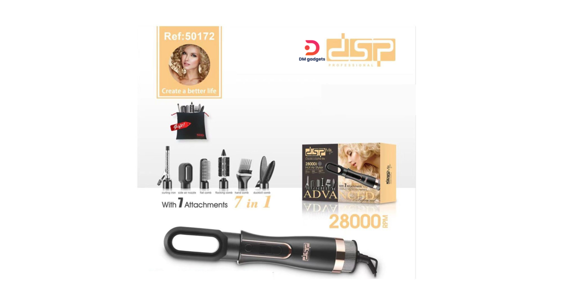 DSP 7-in-1 electric hairbrush that dries, combs, styles, and straightens your hair in no time with the power of air, while protecting it from heat damage and leaving it smooth and shiny. Its ergonomic design with a swivel power cord offers greater freedom of movement when combing. The package includes 7 attachments for drying, combing, straightening, and curling. A professional hair tool that will give you salon results in the comfort of your own home! Features: Voltage: 220-240V~50-60Hz, Power: 800W, Motor type: RS365 DC 18V, Rotation speed: 27000-28000 RPM, Speed settings: Off – Cool – Low – High, Overheating protection, Includes hanger, Accessories: drying head, curling iron, straightening head, 3 different combs and brushes.