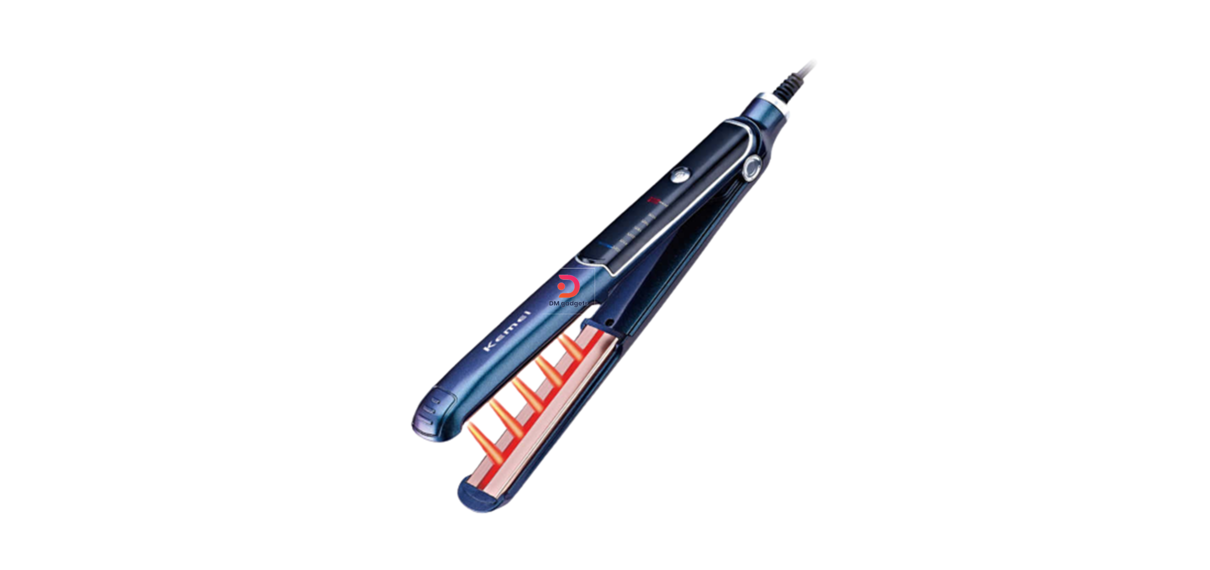 Kemei hair straightener with ceramic plates and tourmaline technology, which protects your hair from heat damage and frizz, delivering a smooth, shiny finish.