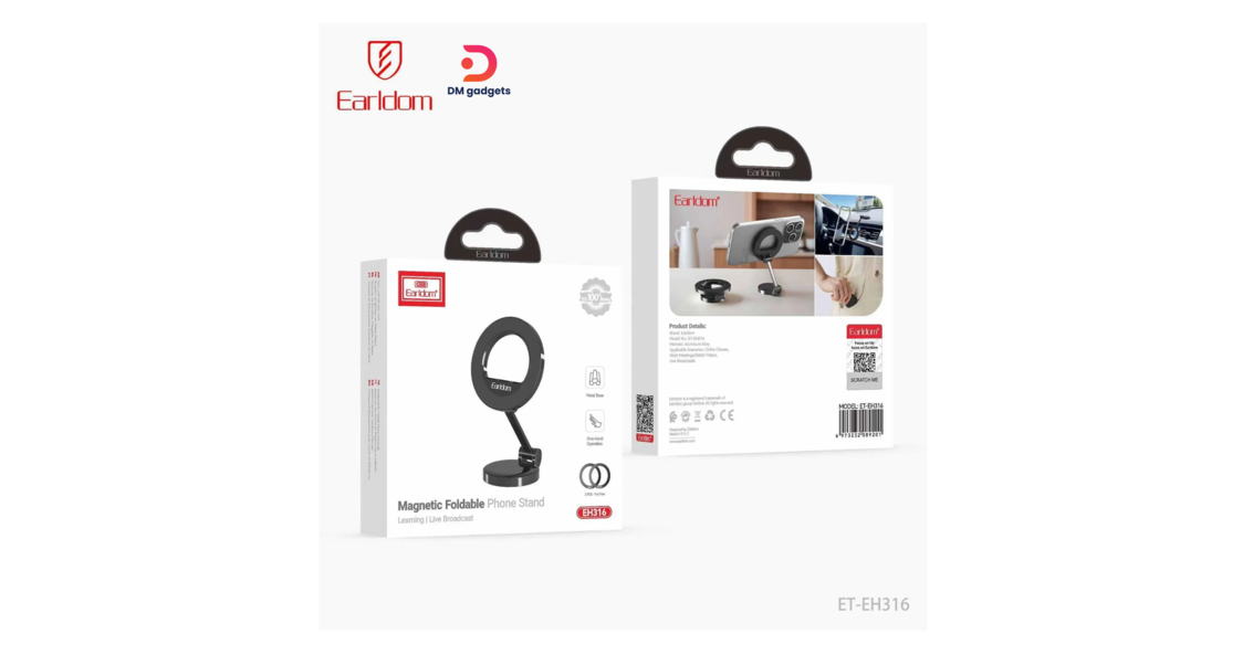 The Earldom ET-EH316 combines practicality and style with its magnetic foldable design and metal base. Perfect for cars, home, or office, it provides 360° rotation for adjustable viewing angles and a compact foldable form for easy portability. Whether you’re attending online meetings, watching videos, or live-streaming, the ET-EH316 offers stable and convenient hands-free use.