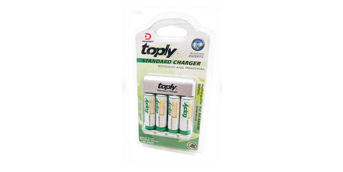 Toply Standard Charger 806B SIZE AA/AAA/9V The toply Goop GD-806B Standard Battery Charger is designed for charging AA/AAA/9V Ni-MH/Ni-Cd rechargeable batteries. It can charge 4 AA/AAA batteries at once and 2 9V batteries individually. The charger features a high-performance design with advanced safety features such as overcharge, over-discharge, overcurrent, and overheating protection. It also includes LED indicators to show charging status and has a compact design for easy portability