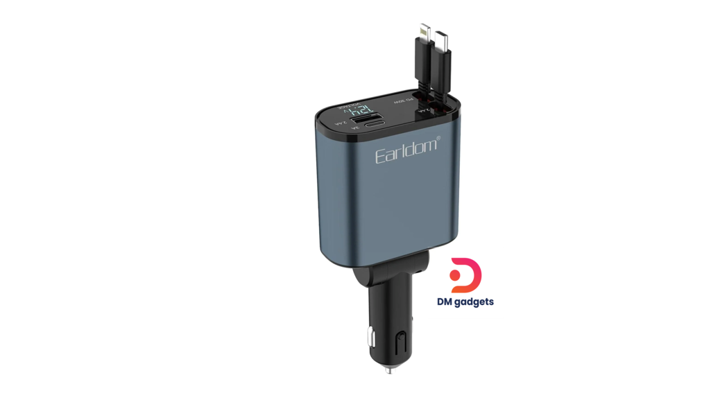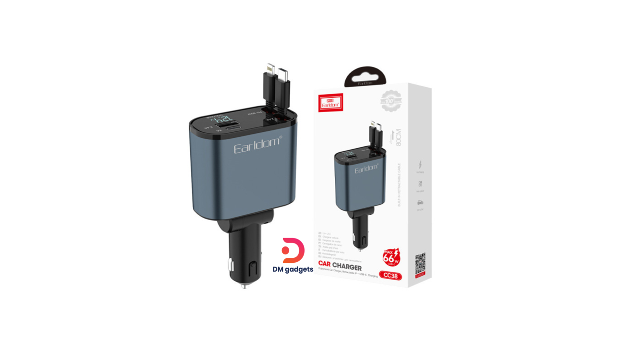 Earldom ES-CC38 Retractable 4in1 Car Mobile phone Charger-Black with Type-C and Ios Cables 80cm &Display Voltage (10-30V)