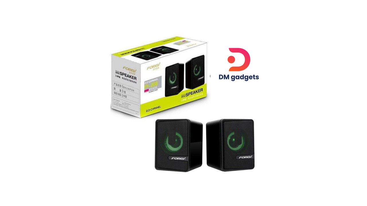 Specification: Forev FV-208. Multimedia audio desktop speaker Simple and elegant model Can be used to play games or listen to music Equipped with RGB LED light Speaker plug via 3.5mm Aux USB port to power the speaker Can be used for many devices that use 3.5mm aux Plug and play Speaker power 3W x 2Speaker diameter 52mmFrequency 60Hz – 23KHzSpeaker impedance 4 ohms USB power supply 5V DC1.2M cable length Product dimensions 90