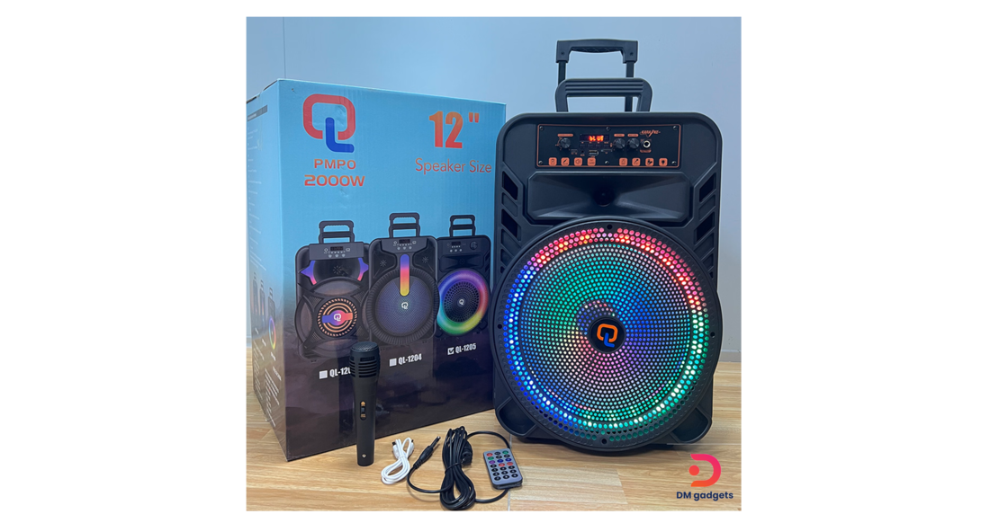 Dual 12″ 2000W Powerful Outdoor Trolley Camping Bluetooth Speaker – with Mic – Black Q-Series Dual 12″ Powerful Outdoor Trolley Camping Bluetooth Speaker Q-Series Dual 12″ Powerful Outdoor Trolley Camping Bluetooth Speaker. Power Output: 2000W for robust sound. Speaker Size: Dual 12″ Connectivity: Bluetooth for wireless streaming Portability: Trolley design for easy transport Microphone Included: Perfect for karaoke and announcements Ideal Use: Outdoor events, camping, parties Battery Life: Long-lasting for extended playtime Features: Built-in handle and wheels for convenience Sound Quality: Clear, powerful, and dynamic audio Additional Inputs: USB and AUX for versatile use Enhance your outdoor events with the Q-Series Speaker, combining power and portability for an unmatched audio experience. Specifications Product Type Speaker Model Number QL-1203 Speaker Size Dual 12″ speakers Power Output 2000W Features Trolley design, built-in Mic Connectivity Bluetooth, AUX, USB Battery Life Up to 6 hours